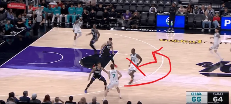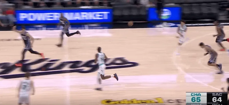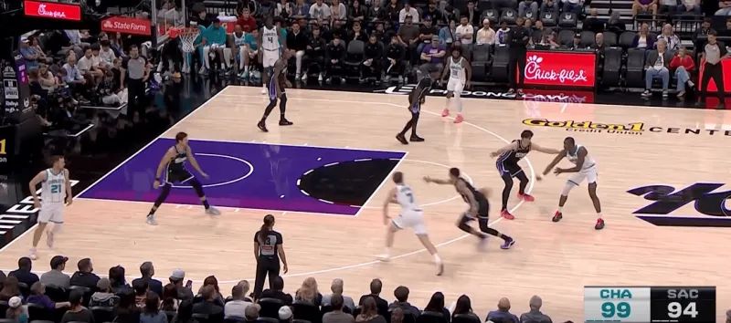 转换进攻的机会三球迅速交给前场迪亚巴特,随后后者和Kon在前场展开单侧的二人转掩护,克尼普尔利用雷诺忌惮迪亚巴特顺下果断快速收球完成突破终结: