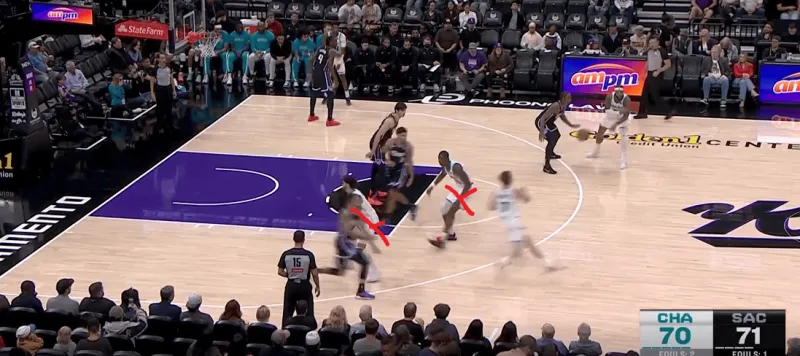 黄蜂阵地战的L系列跑位战术,克尼普尔从底角启动,先借布里奇斯掩护随后从中路走迪亚巴特掩护兜出,本质是gut stagger的起手,克利夫德示意德罗赞提前换防,